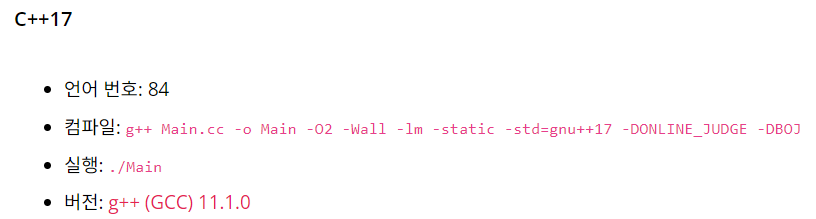 주로 Problem Solving을 할 때 사용하는 컴파일러가 GCC이고 Visual Studio에서는 Visual C라는 컴파일러를 사용한다. 그래서 Visual Studio에서는 되는 풀이가 문제풀이 사이트에서는 안되는 경우도 있는 것이다. 프로그래머스에서는 Clang이라는 컴파일러를 사용하고 있긴하다. 아래 그림은 백준에서 사용하는 C, C++ 컴파일러 정보이다.